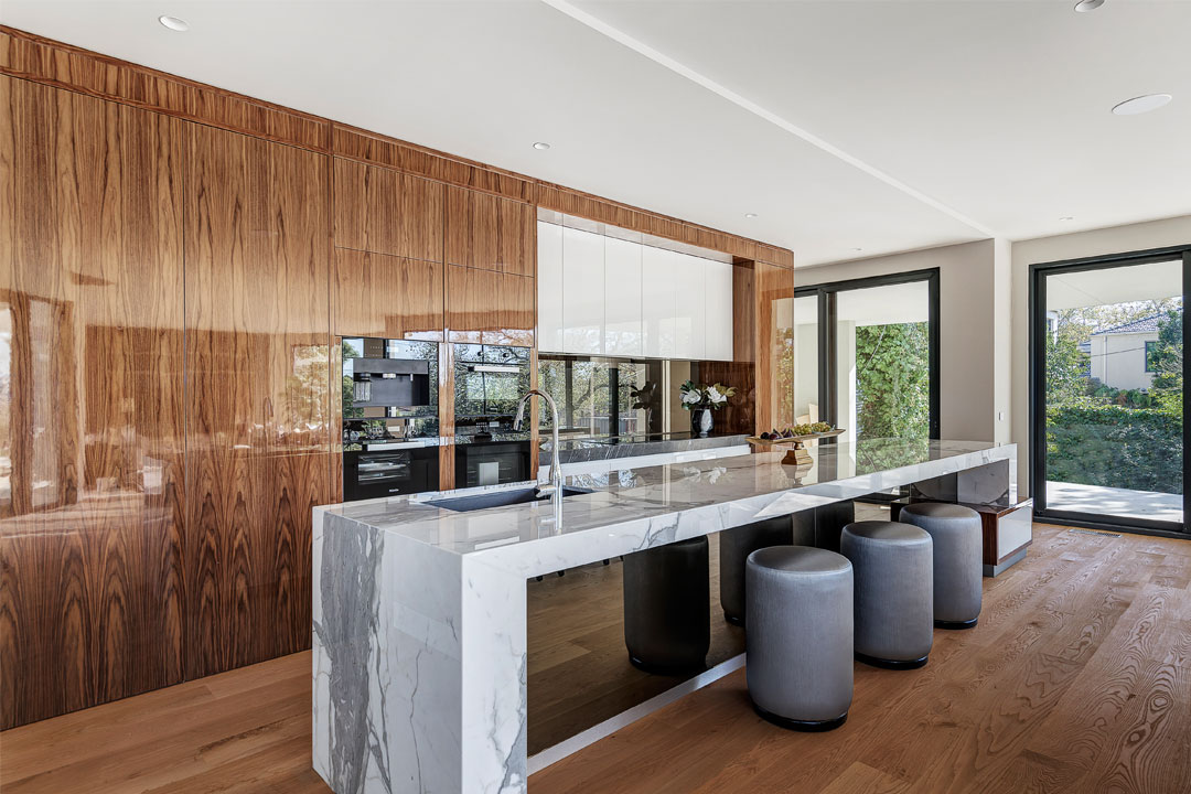 “It’s a positive experience to be recognised for our high standard of design and craftsmanship,” says Jason Grollo from Grollo Homes. “My favourite feature is the splashback that doubles as a two-way mirror into the butler’s pantry.” The splashback is encompassed by floor-to-ceiling cabinetry that’s fitted with intriguing American walnut veneer doors. Also running the length of the kitchen, a spacious island bench displays a luxurious suspended Calacatta marble top.