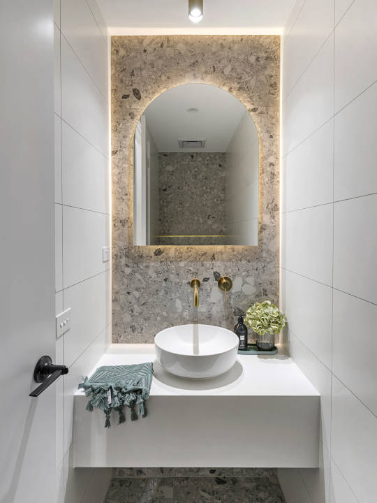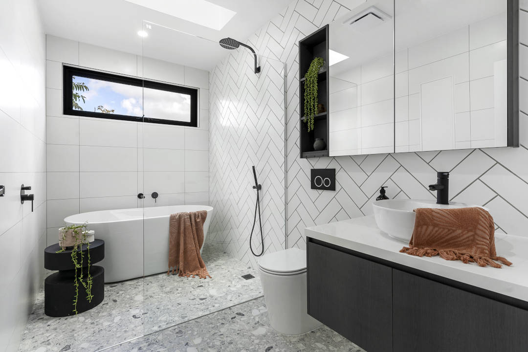 Elements of the home’s cool and contemporary façade are continued throughout the design for visual continuity, making the interior as effortlessly sophisticated as the exterior. A free-flowing dining and living area opens out onto the home’s backyard, both serviced by a spacious kitchen and its respective butler’s pantry. Chic black cabinetry is countered by smooth white stone countertops and a waterfall island. The same stone is utilised in the living room as a svelte in-built TV unit. Stepping outside, guests are treated to an alfresco dining area, and beyond the deck lies a manicured garden and the home’s double garage. Sitting atop this garage is a private studio, equipped with an en suite – making it the perfect place for guests to relax in seclusion from the main home.