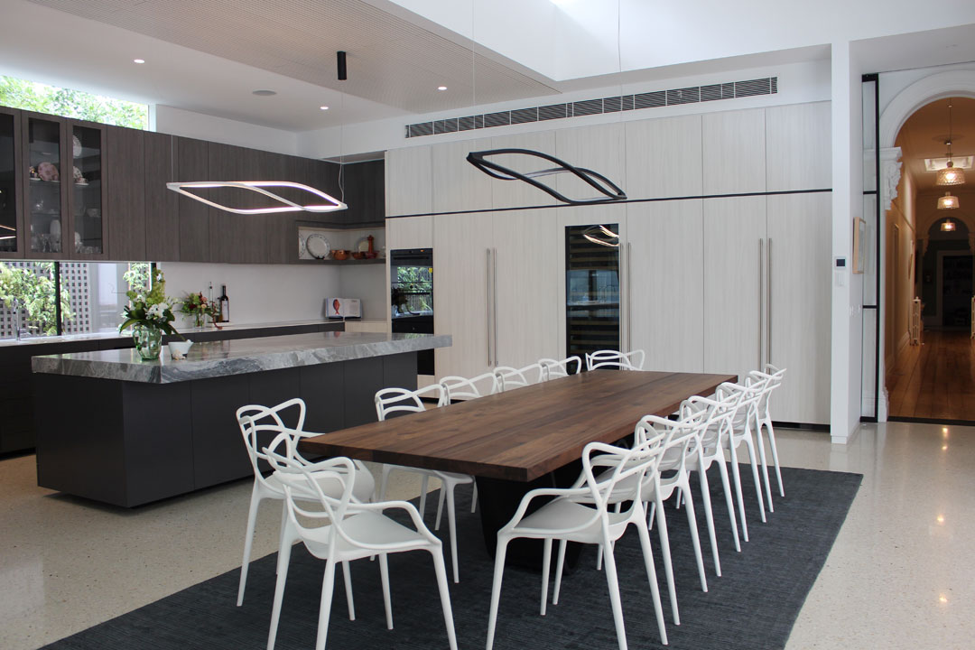 Built by Fleetwood Building Design & Construction and designed by N2SH Interiors Styling + Décor, this ultra-modern home extension features high-quality finishes and fixtures, as well as elegant new living spaces and amenities. Working closely with the clients, the team achieved the brief by creating a future-proof home that still honours its original Edwardian design.
