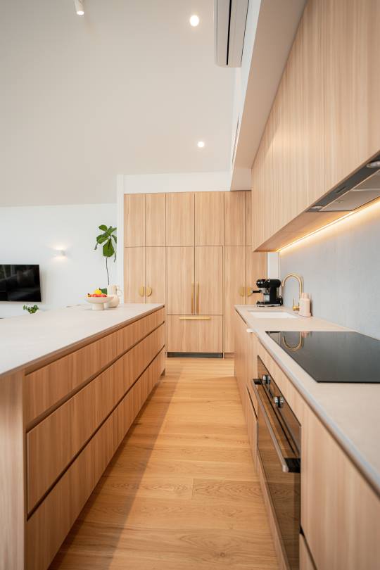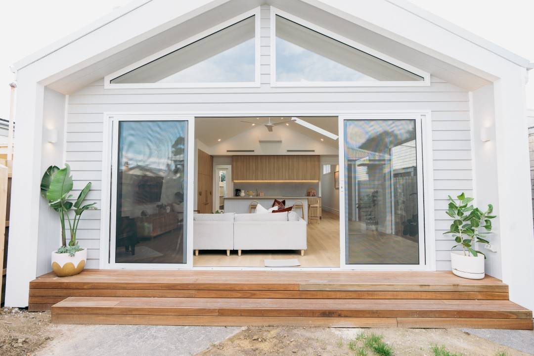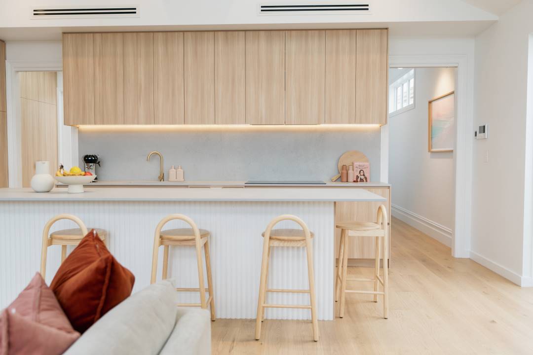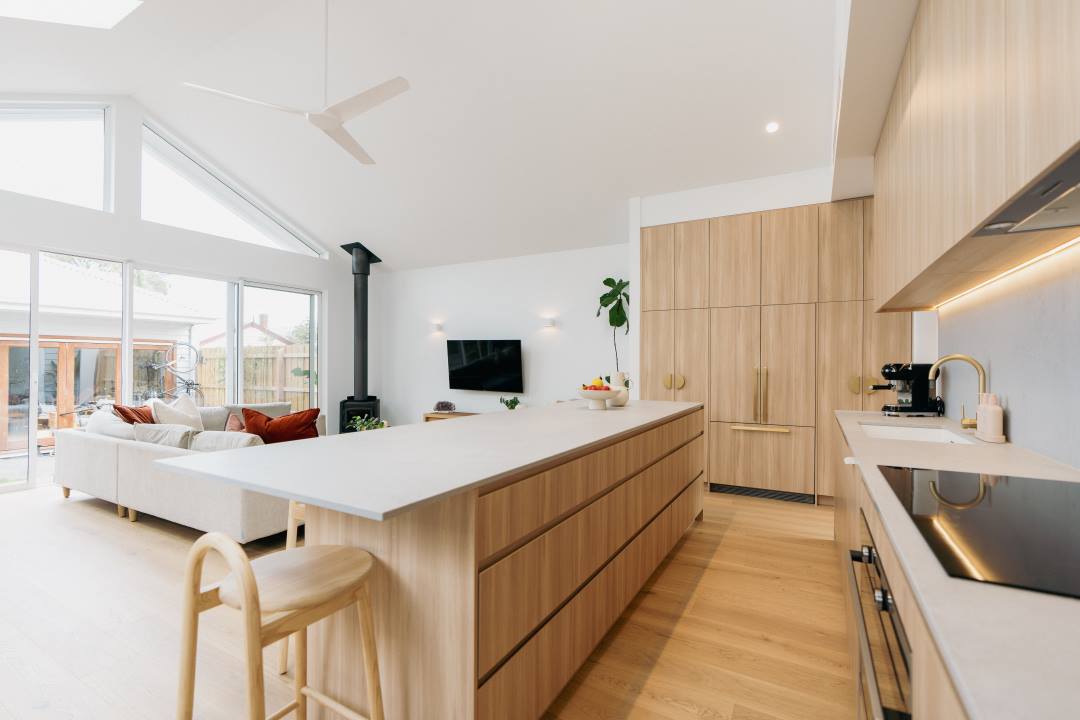 At the core of this rejuvenation is the expansive open-plan living, dining and kitchen area, established as the focal point of the home. This space blends timber tones with fresh, natural hues, fostering a coastal-inspired contemporary aesthetic. The high, raked cathedral ceilings, dotted with skylights, lift the home’s modest proportions, imparting a sense of grandeur and spaciousness that complements the breezy, coastal-style interiors.