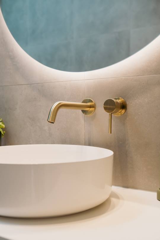 The renovation has put a spotlight on the family bathroom, transforming it from a dimly lit, awkward space into a bright, modern sanctuary. A freestanding bath placed at one end, under a large Velux skylight, brings in light and elegance, complemented by a sleek, wall-mounted vanity and concealed cistern toilet. Illuminated mirrors and contemporary concrete-style tiles with brass fixtures enhance the room’s luxury and functionality, demonstrating a sophisticated design focus.