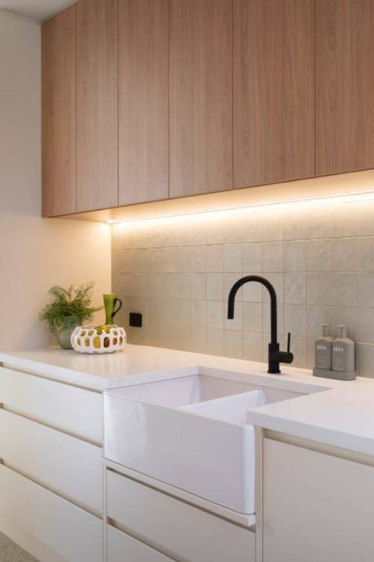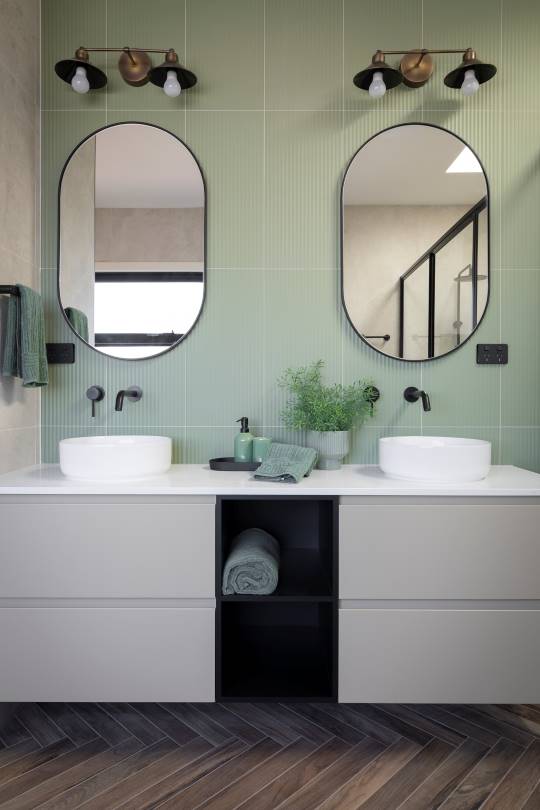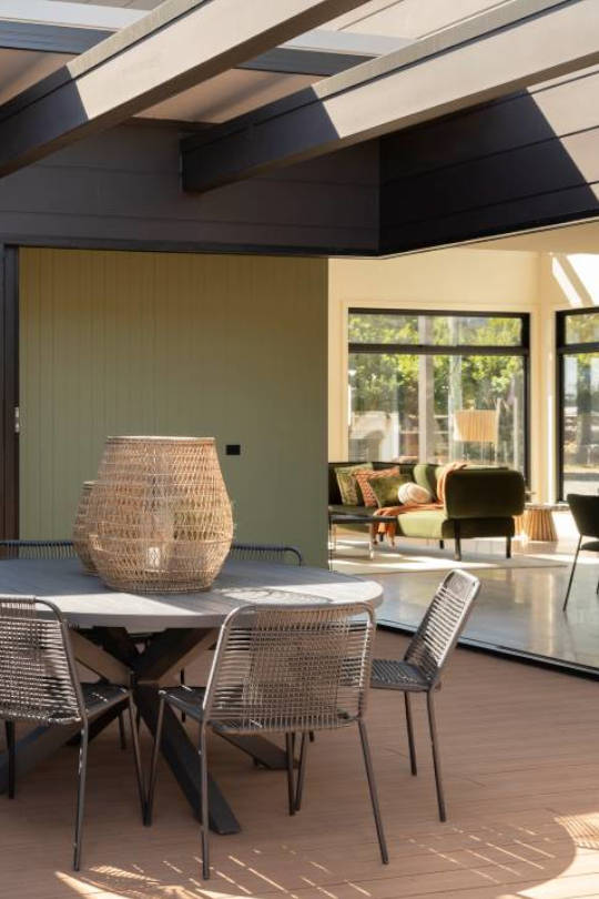 The client’s brief was simple. They wanted to bring the natural elements of the landscape into the aesthetic of the home, combining accents of timber and stone with some black features to add drama and character. Natural light was also a prominent focus, with the goal to enhance its presence through indoor-outdoor integration. The team met these desires masterfully, assisting the client with their material selection and perfectly executing the build using high-quality, local trades and luxury materials and suppliers. In the interior, these include polished concrete in the colour ‘New York’ and custom light fittings from Little Anvil.