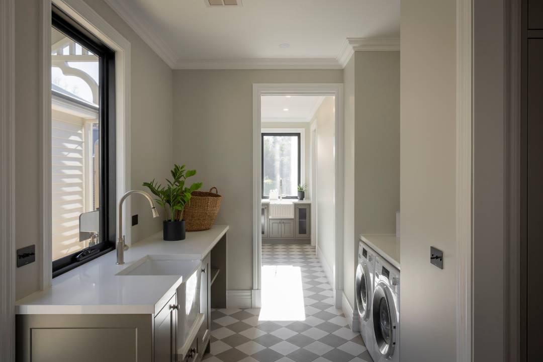 Culminating in thoughtful, clean lines and high-end finishes, this home is a celebration of heritage and workmanship, effortlessly marrying timeless design with modern functionality. Inspired by Federation architecture, the interior fit-out showcases an impressive level of detail, from elegant archways and wall panelling to bespoke features like a custom alcove rangehood and harlequin tiling. Purposeful feature lighting adds warmth and charm throughout, making every nook within the home feel considered and inviting.