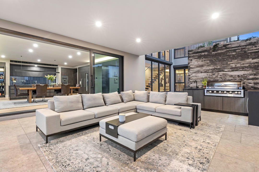 The entrance with its 5.8-metre-high void provides an impressive introduction to this incredible family home. Views to the waterway have been optimised from all living areas and from three of the five bedrooms. Oversized stacking sliding glass doors open out to the generous covered outdoor entertainment area, complete with barbecue and outdoor kitchenette.
