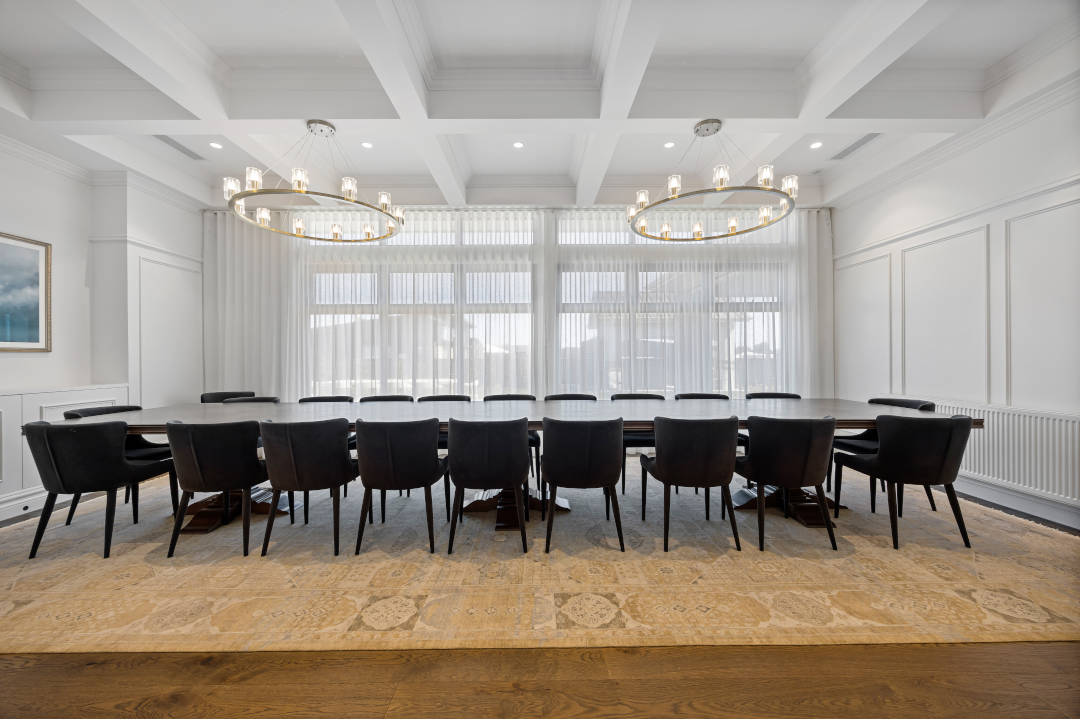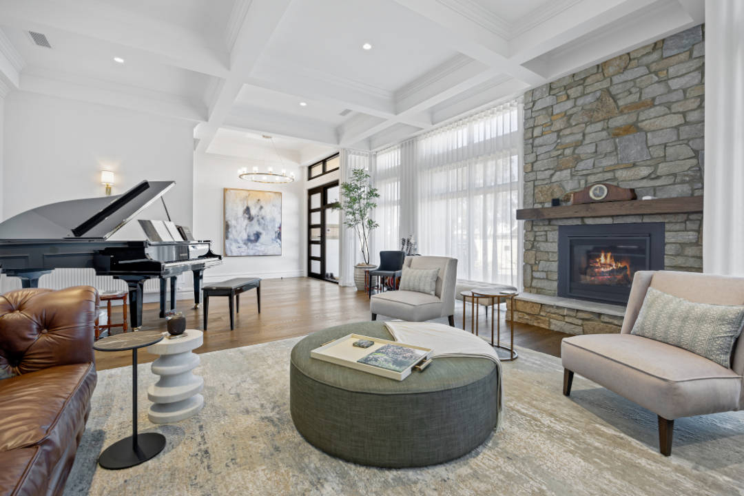 Upon entering, you are greeted by breathtaking coffered ceilings that lead into a warm, inviting space ideal for entertaining. The generous kitchen, bathed in natural light and adorned with a light colour palette, features elegant wall panelling that adds soft texture, enhancing its homely feel. A large island bench makes it a perfect communal area for grand gatherings and intimate dinners, whilst the hand-laid natural stone on the fireplace and chimney adds incredible depth and character.