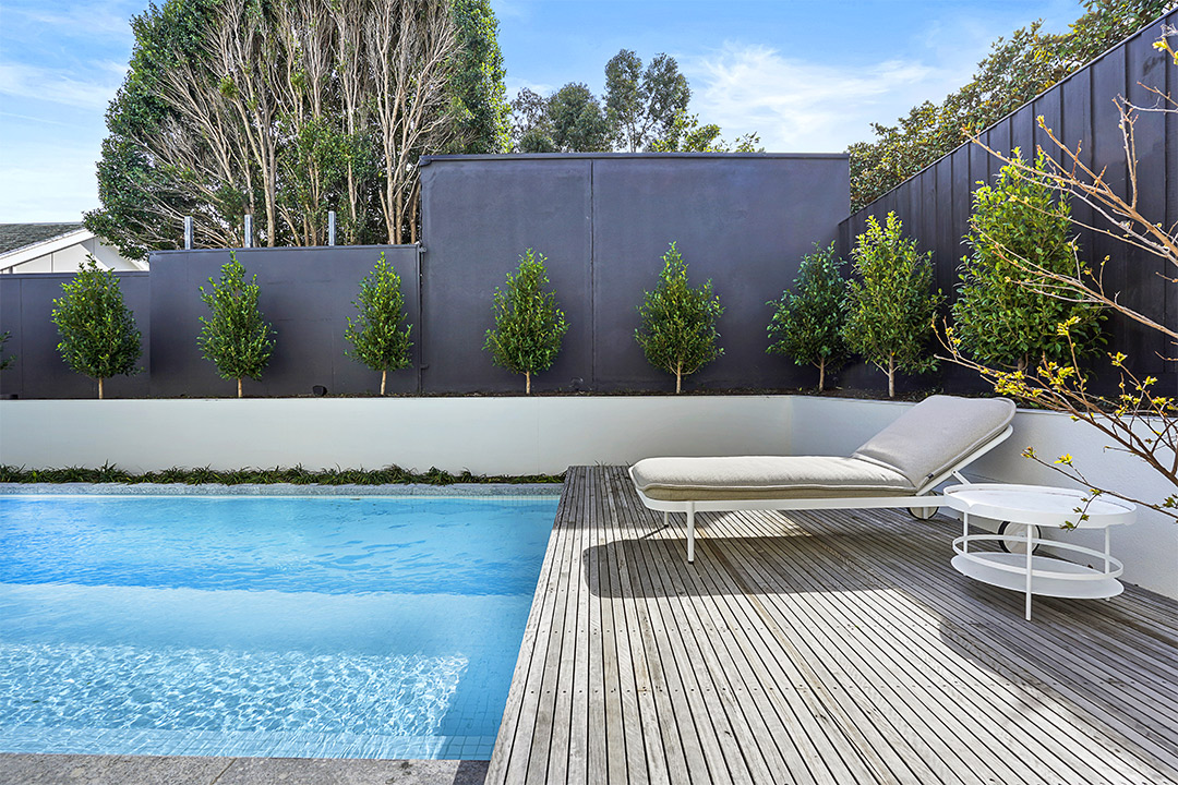 Sleek and sophisticated, the pool is positioned against the property’s perimeter, allowing for the space to be effectively utilised. The objective given to Neptune Pools was clear: family fun was paramount – an understandable requirement for a young family. However, given the homeowners’ fitness-related careers, ensuring there was enough room to exercise was also important. Utilising the property’s boundary as a guideline, the 14.9m x 2.2m swimming pool allows ample room for an alfresco area but can still be used as a lane pool. Having recently renovated the house, the natural progression was to renovate the alfresco areas to complement the home’s chic, modern aesthetic. Clean, crisp materials enhance the beautiful home and its pristine landscaping to create a polished overall look.