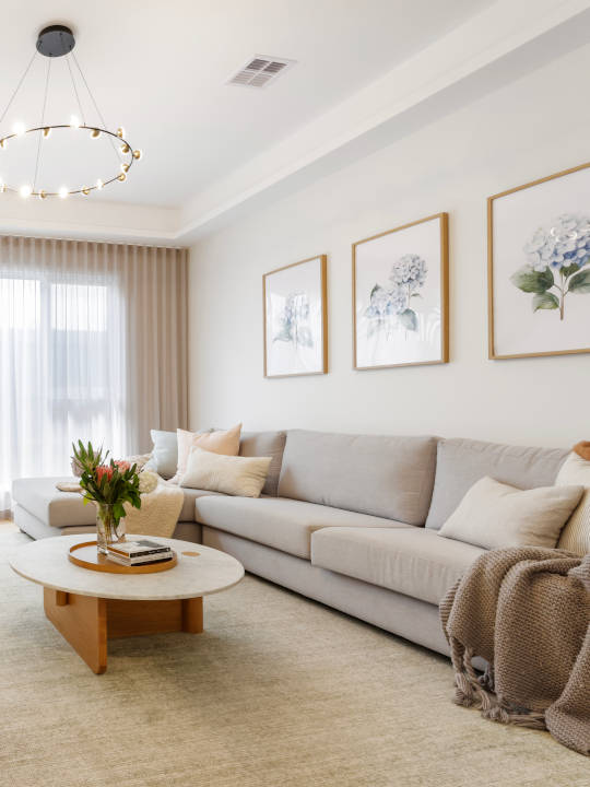 The backyard is every child’s dream – with a state-of-the-art half basketball court to re-live your hay day or practice your skills, and a beautifully tiled pool with a built-in spa to soak up the summer days. The open layout of the living room encourages family cohesion and design fluidity, with the kitchen design serving as the centrepiece in a masterclass of functional entertainment. The grey-veined island bench is the heart of the space, allowing ample room for seating and LED strip lighting to add impact and subtle drama. A subtle colour palette is used throughout the home, consisting of muted greens and greys, soft pinks and natural tones, creating a soothing sense of cohesion.