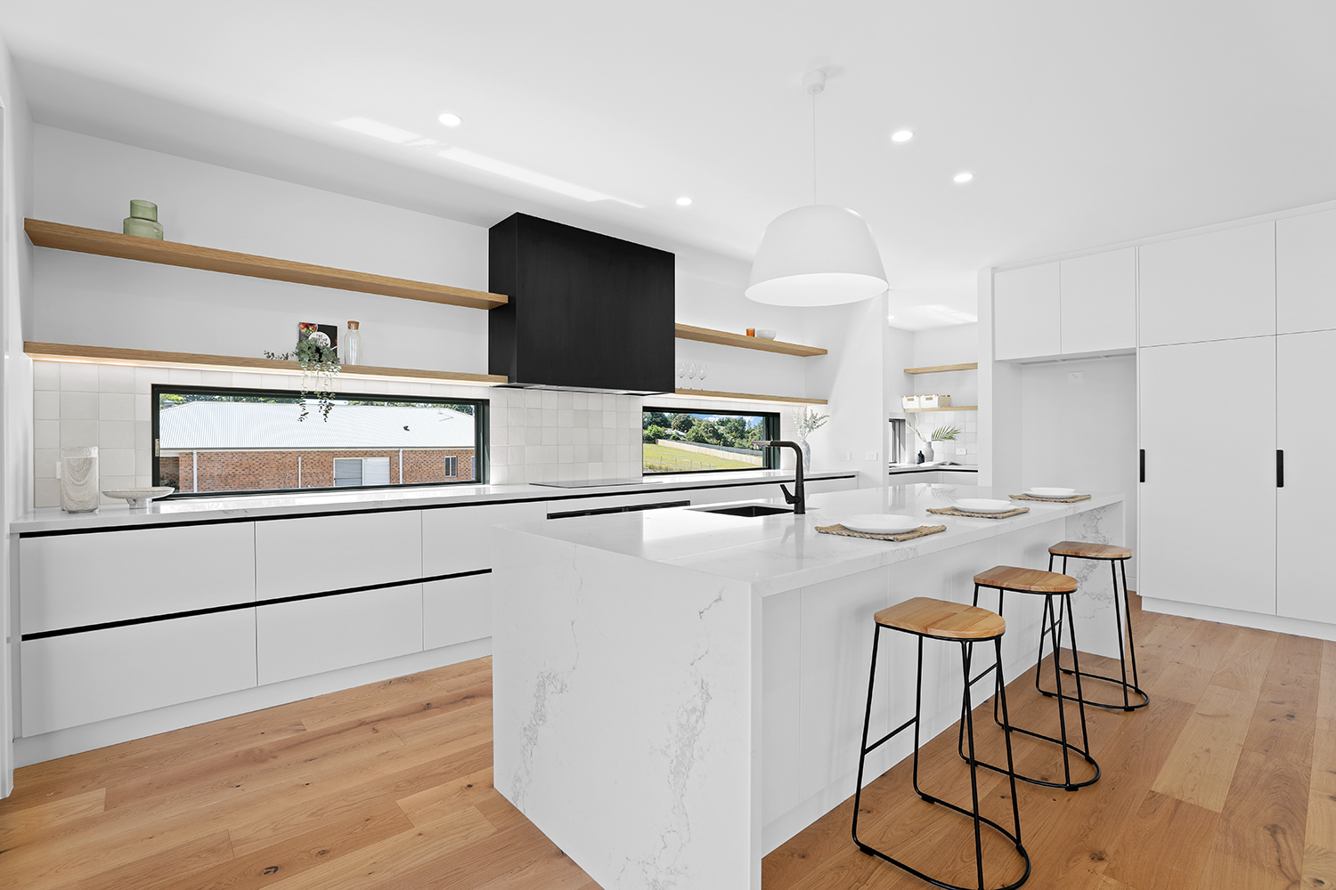 Brick and timber throughout the house exude calming country tones with splashes of brick reminiscent of bustling urban landscapes. Communal socialisation is relegated to the kitchen, living and dining area, with the ceiling widening to embrace a stylistic pitched high ceiling that emphasises the magnificence of the wide windows. Gentle, warm natural light is invited into all corners of this room, making it a lovely place to spend time with family and friends.